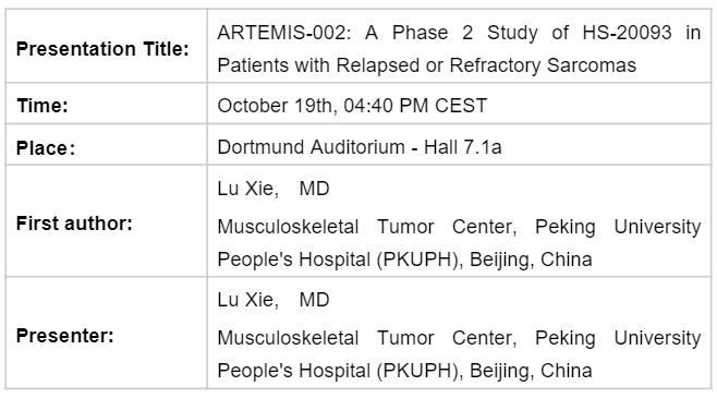 ● HS-20093 (licensed to GSK as GSK5764227) administered at 12 mg/kg every 3 weeks showed promising efficacy signal in patients with relapsed or refractory (R/R) osteosarcoma and soft tissue sarcoma (STS);