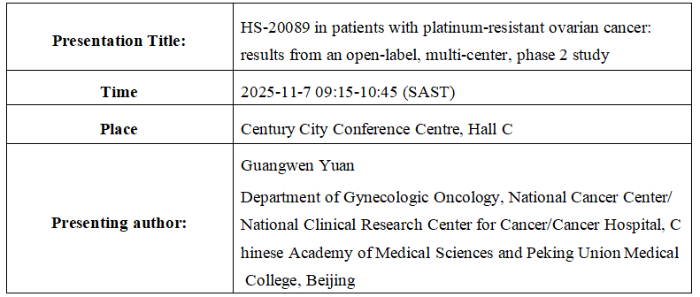 Hansoh Pharmaceutical Group Co., Ltd. (Hansoh Pharma, 03692.HK) today announced that positive Phase 2 results of HS-20089 (licensed to GSK as GSK5733584), a B7-H4-targeted antibody-drug conjugate (ADC), in platinum-resistant ovarian cancer (PROC) were presented as an oral presentation at the 2025 International Gynecologic Cancer Society (IGCS) Annual Global Meeting (November 5–7, Cape Town South Africa.). The findings were first presented at the 2025 European Society for Medical Oncology (ESMO) Annual Meeting.